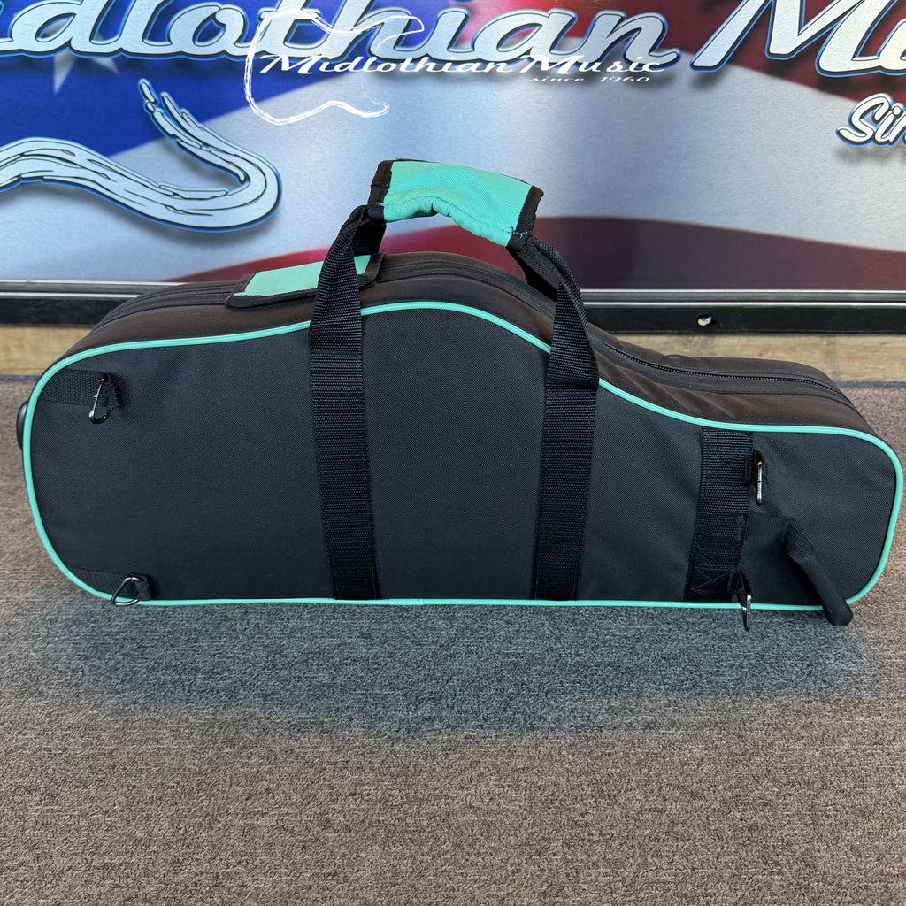 The case also features a wrapped webbing handle, removable backpack straps with metal hardware, an additional "subway style" handle for easy transport, soft foam interior compartments that securely hold the neck and mouthpiece, a large exterior storage pocket, and a front pocket organizer provides plenty of room for accessories.