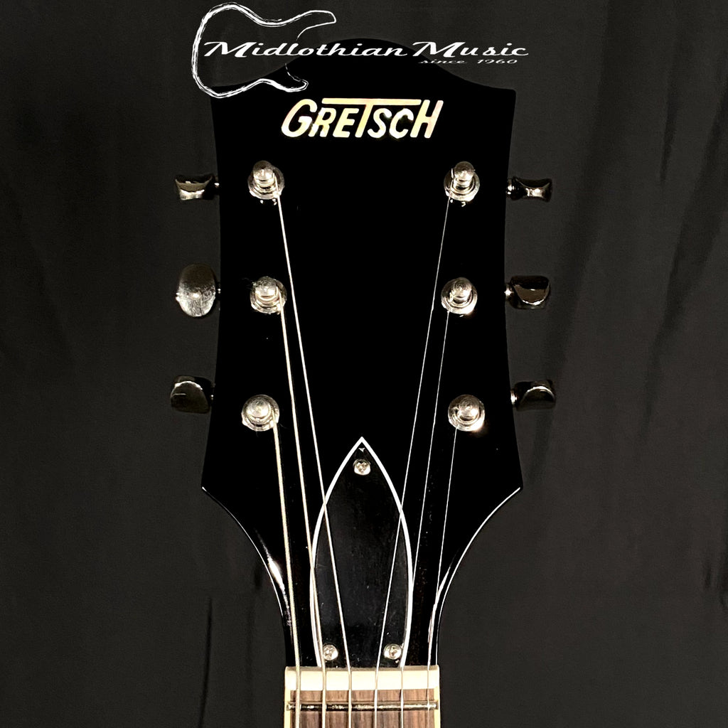 Designed for pure tone and slick, comfortable playing feel, this guitar features the classic aesthetics, nickel G-arrow control knobs, aged white binding with black purfling, durable gloss urethane finish, aged pearloid thumbnail inlays, silver vintage thick plexi pickguard with Gretsch logo and nickel Grover Sta-Tite tuning machines.
